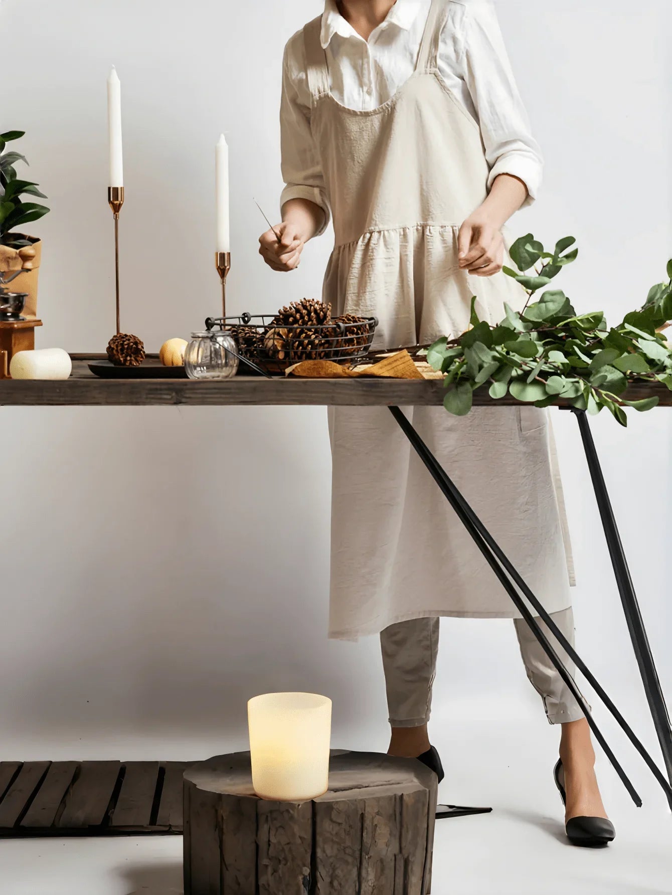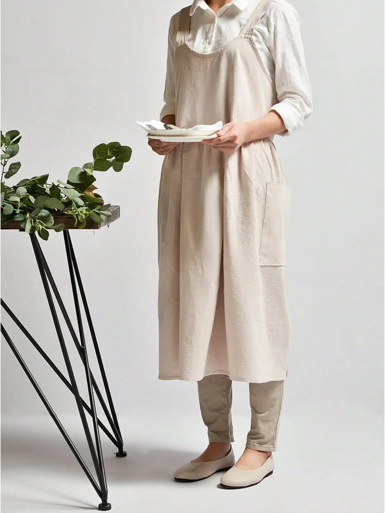 Made from 80% cotton and 20% linen, this apron features high-quality washed cotton fabric, ensuring softness and comfort against the skin. It includes roomy double pockets, providing ample space for storing utensils or small items while you work. The apron offers excellent coverage, extending from chest to knees, providing protection from kitchen grease, food spills, stains, paint, dirt, and other messes. Please note: this apron is not water or oil-proof. For a complete view, please check the yellow apron for the back photo.