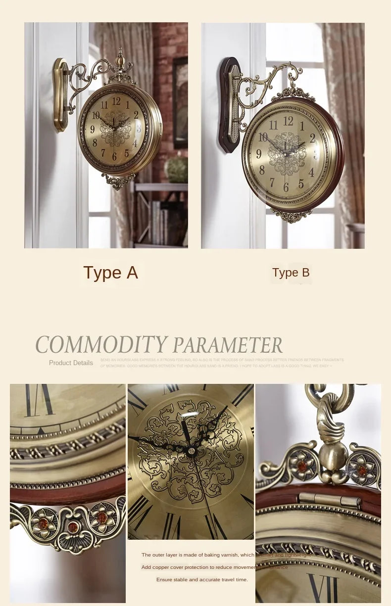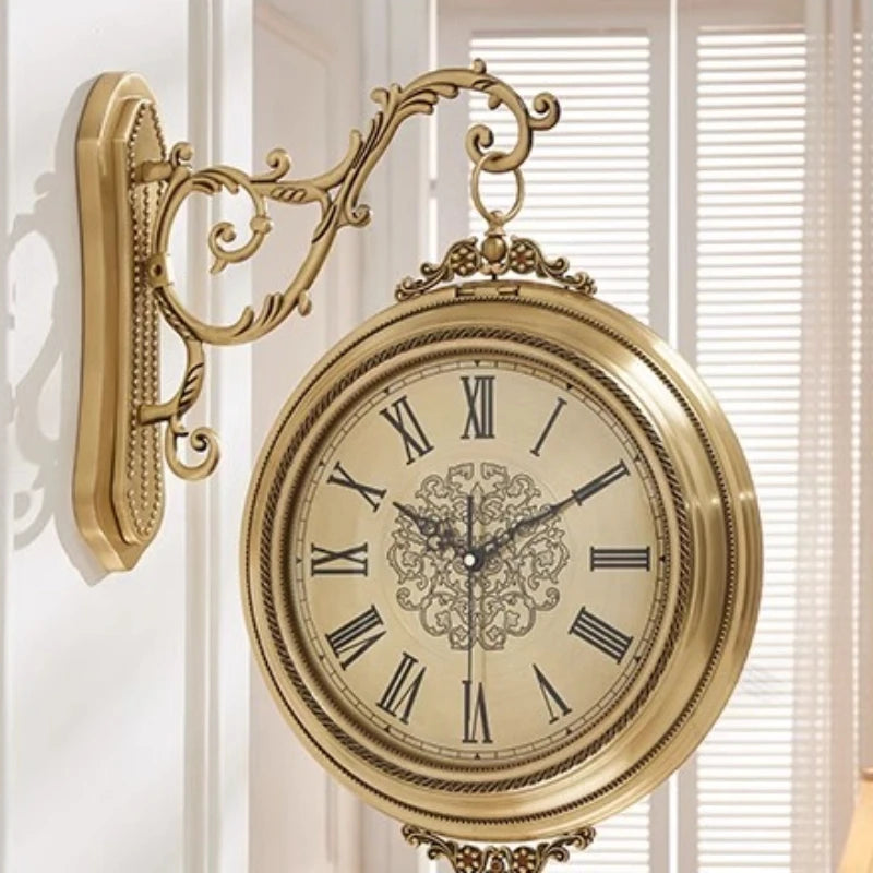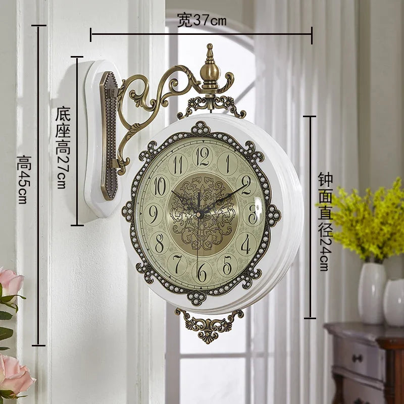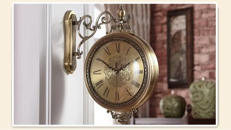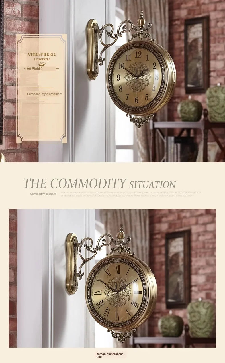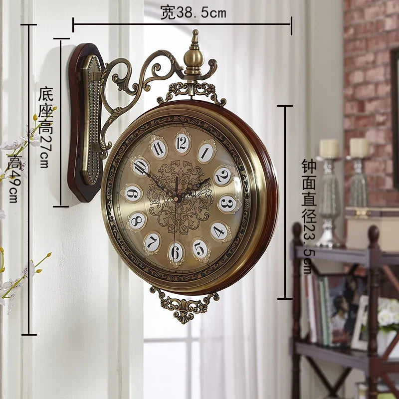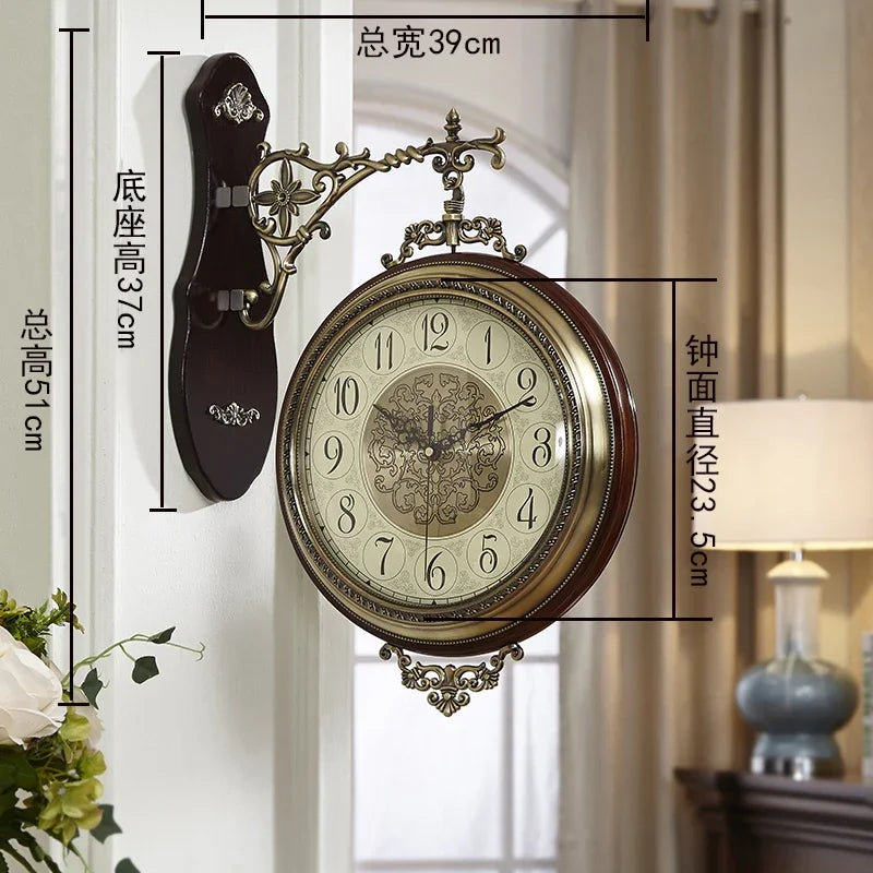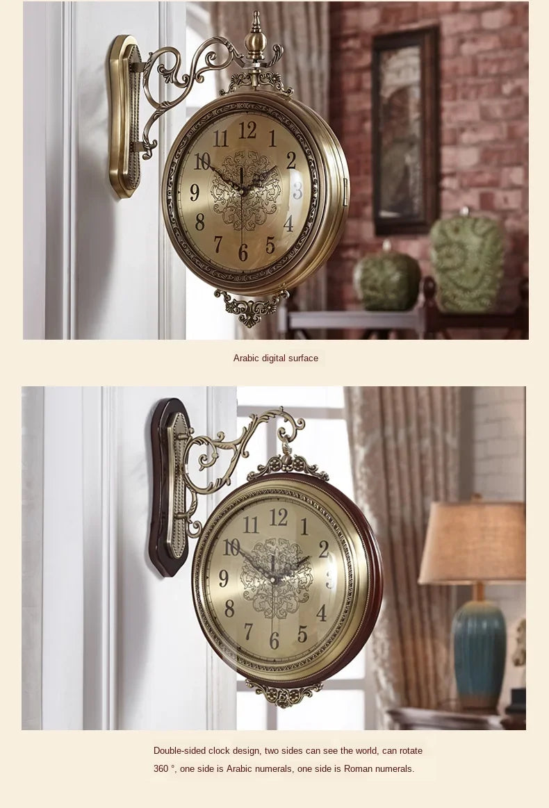 The Double-Side Silent Wall Clock is a striking blend of luxury and functionality, designed to enhance any living room or home decor. Crafted from solid wood and metal, this large clock features a unique double-sided design, making it both practical and decorative. The retro golden accents add a touch of elegance, while the silent mechanism ensures a peaceful environment. Perfect for Nordic and luxury-inspired interiors, this clock is a stunning home decoration and a thoughtful gift for those who appreciate high-quality craftsmanship and timeless design.