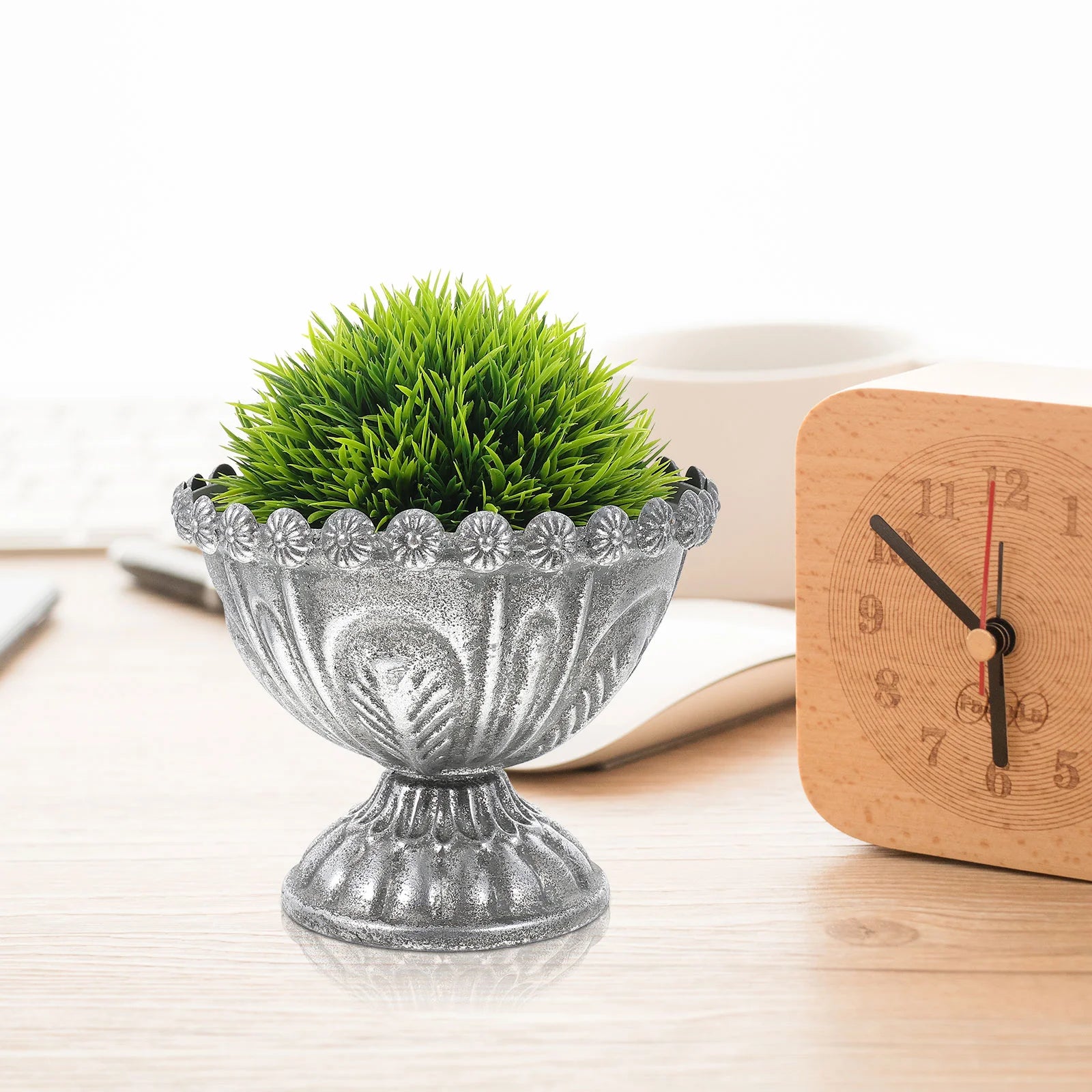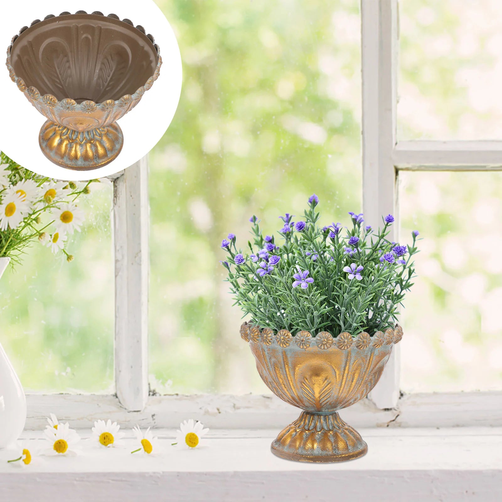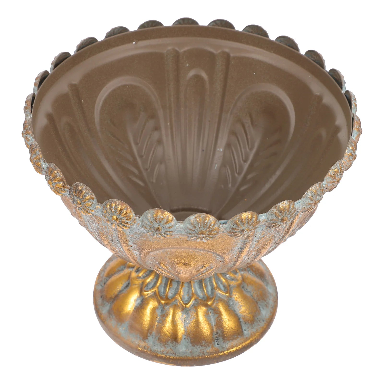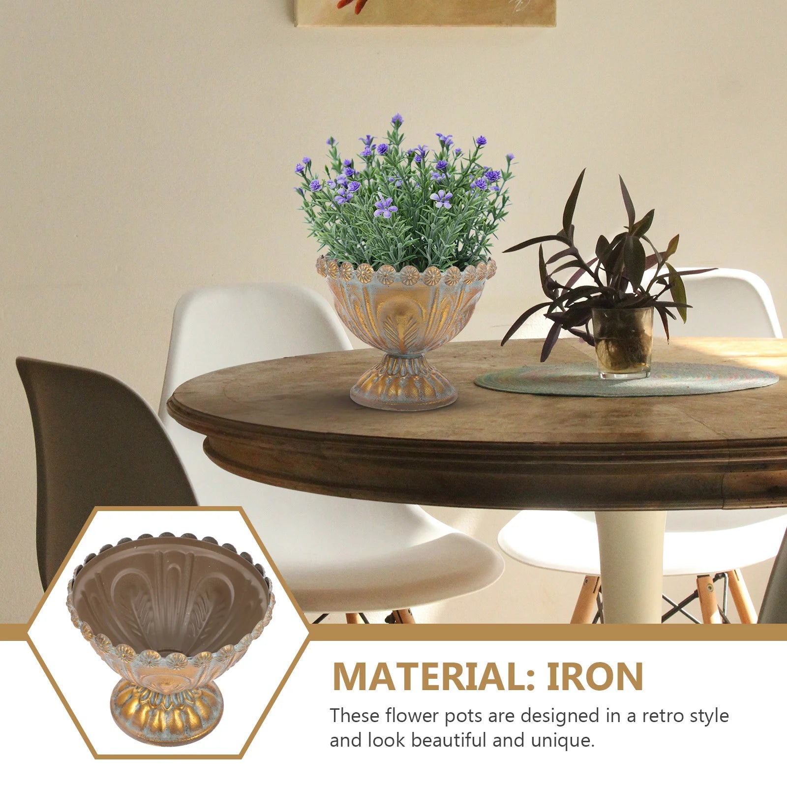 Der Vintage-Blumentopf aus Eisen in Gold und Silber bietet eine charmante Mischung aus rustikaler Eleganz und Vintage-Charme. Gefertigt aus robustem Eisen besticht dieser Blumentopf durch sein wunderschönes Used-Finish mit einer Kombination aus Gold- und Silbertönen, die einen auffälligen, antiken Look erzeugen. Perfekt für den Innen- und Außenbereich, verleiht er jedem Raum eine edle Note, ob als eigenständiges Dekorationsstück oder als Übertopf für Ihre Lieblingsblumen oder -pflanzen. Sein einzigartiges, zeitloses Design macht ihn zur idealen Wahl für die Vintage-Wohnkultur, den Garten oder als aufmerksames Geschenk für alle, die rustikalen Charme und Eleganz schätzen.